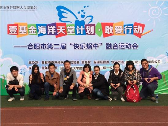 2014年11月16日上午9:00,2014级社科类硕博班“大手牵小手”主题团日活动暨第二届“快乐蜗牛”融合运动会,在合肥市春芽残疾人互助协会的支持和芳草社人文学院中队的协助下,于合肥工大子弟学校操场顺利举行。我班此次团日活动主要是帮助并协同16岁以上轻度智障残疾人士参加运动会。