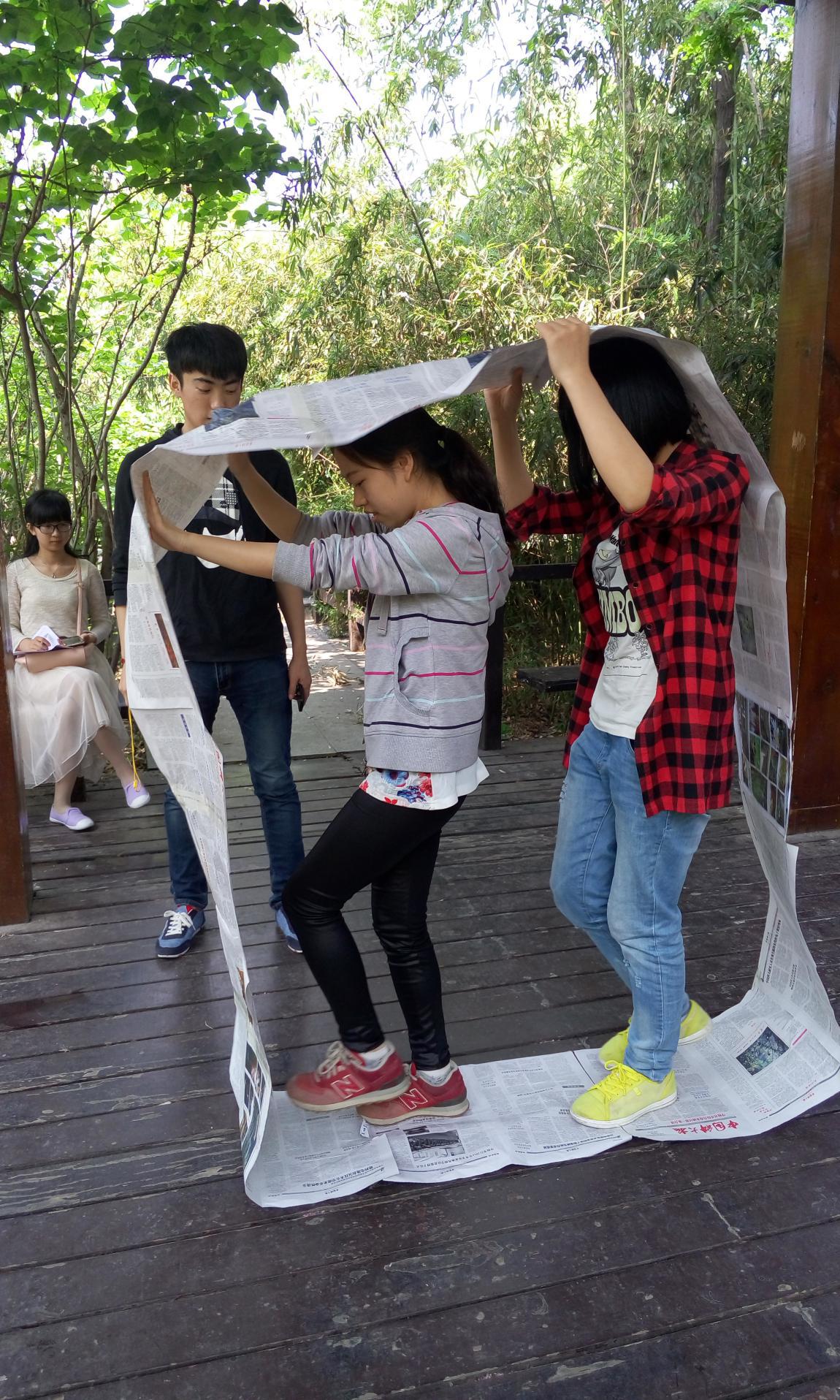 第一项活动为“行进坦克链”。组织委员将20张报纸围成一个可以行进的履带式的环,把全班分成三组,每组两位同学进行记时比赛。各组统一在风火轮内站好,由裁判统一发布口令出发;行进途中,风火轮必须垂直地面,所有组员必须在圈内,身体的任何部分不得直接接触地面。行进过程中若风火轮断裂必须在原地修复,在裁判许可后才可以继续行进。这项活动旨在培养同学的肢体协调性和团队合作精神。