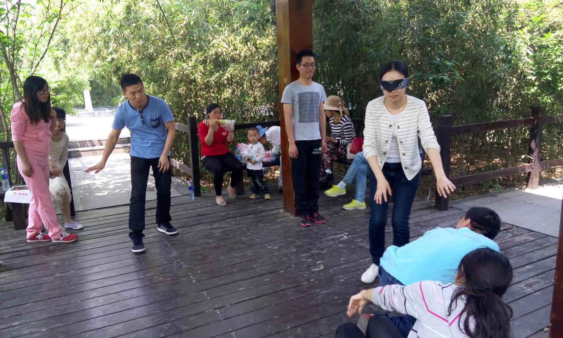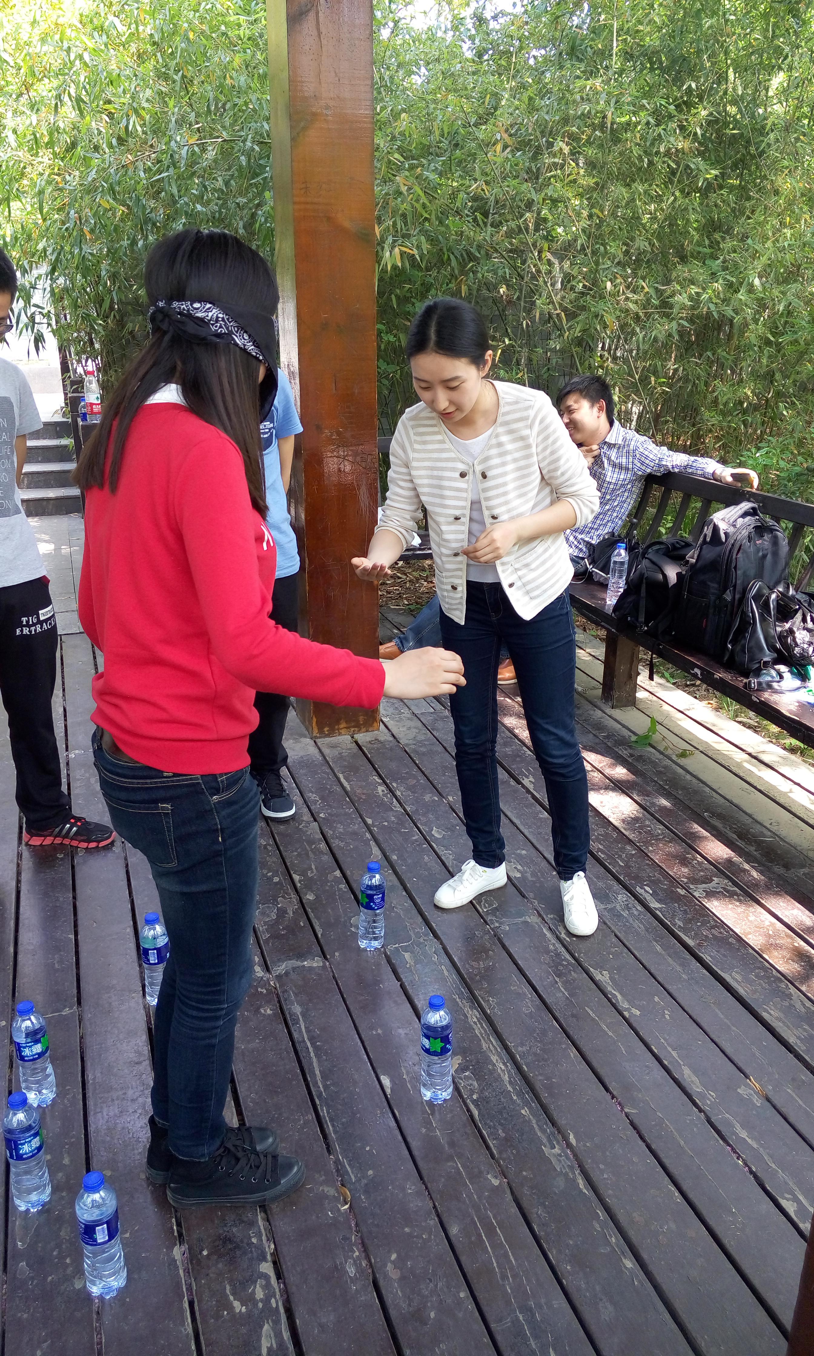 第二项活动为“盲人行走”。两位同学为一组,一个人带眼罩行走,另一人言语指导提示,游戏过程中不得碰到矿泉水瓶,用时最短获胜。这项活动旨在培养团队内部个人之间的信任感,同时消除成员之间的隔阂,营造亲情化的团队氛围,为以后进行的拓展项目打下信任基础。