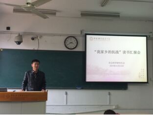 为纪念中国人民抗日战争暨世界反法西斯战争胜利七十周年,人文与社会科学学院社会科学研究生会于2015年11月15日举办了以铭记英烈、热爱家乡为主题的“我家乡的抗战”读书汇报会。