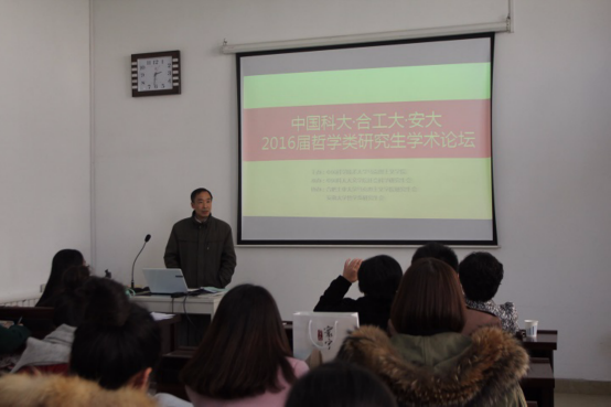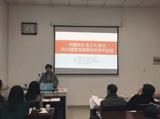 2016年12月3日下午,中国科大•安大•合工大2016年哲学类研究生学术论坛在人文学院南平102举办,三校研究生代表以“经典的现代诠释”为主题展开交流。中国科学技术大学人文与社会科学学院潘正祥老师、张翔老师以及汤俪瑾老师应邀担任此次论坛的嘉宾老师。