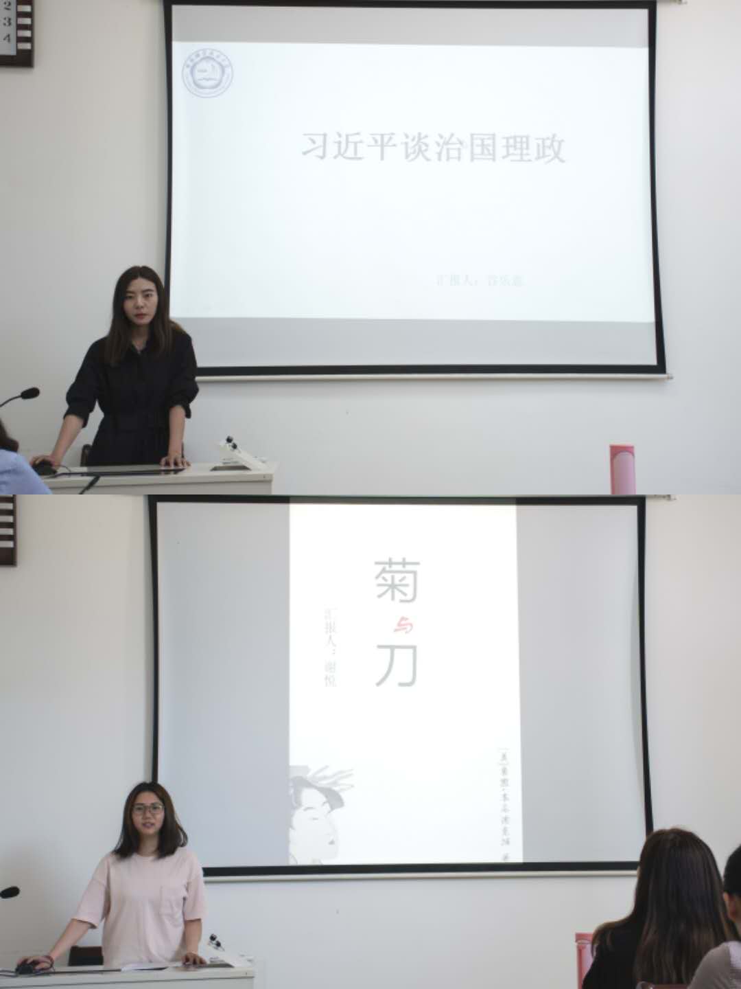 读书会上,谷乐意和谢悦同学分别上台为大家进行了汇报展示。谷乐意同学跟大家分享的书籍是《习近平谈治国理政》,她聚焦时事,从叙利亚战争入手强调和平发展对于我们的重要性,引出习近平总书记关于和平发展的理论和构建人类命运共同体的重要思想,强调走和平发展道路是中国人民对实现自身发展目标的自信和自觉,中国将坚定不移的走和平发展道路。她的解读,加深了同学们对习近平新时代中国特色社会主义思想尤其是外交新理念的学习感悟。同时,她也呼吁我们青年学子应该从自身做起,努力为世界和平发展贡献出自己的一份力量。谢悦同学展示了对美国人类学家本尼迪克特的《菊与刀》的读书心得。她先通过询问大家对日本人的印象引出今天分享的内容,接着对著作作者、创作背景、主要内容等进行了梳理阐释,着重分析了日本独特的文化传统和民族性格,以及产生这种矛盾性格的缘由。最后,谢悦同学向大家解读了一下这本书的学术贡献及对我们的现实意义,指出我们应多加深刻地了解其他国家,知己知彼方能促进各国政治经济文化交流,建立起良好的外交关系。