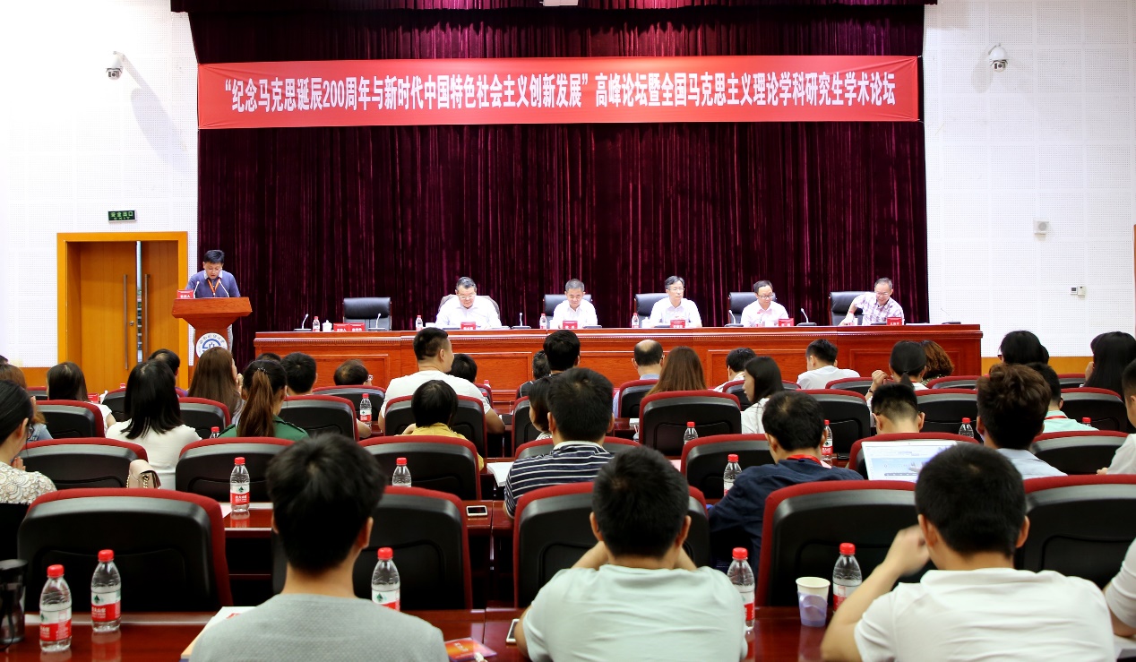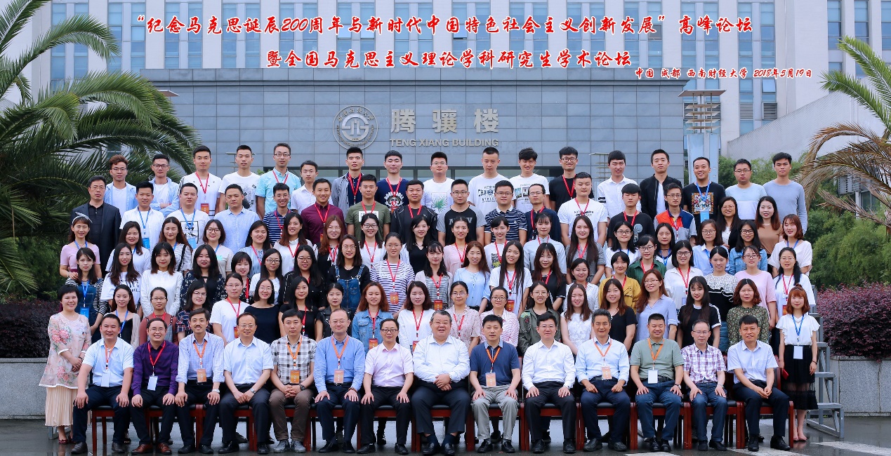 为隆重纪念马克思诞辰200周年,深入学习贯彻党的十九大精神,大力推进新时代中国特色社会主义创新发展,培养一批具有坚定理想信念和深厚理论基础的马克思主义理论学科优秀青年人才,西南财经大学马克思主义学院、中共四川省委党校马克思主义学院、《理论与改革》杂志社于2018年5月19日联合举办“马克思诞辰200周年和新时代中国特色社会主义创新发展”高峰论坛暨全国马克思主义理论学科研究生学术论坛。来自中国社会科学院、复旦大学、浙江大学、武汉大学等高校和科研机构的近百名专家学者、师生代表汇聚于此,围绕马克思诞辰200周年和新时代中国特色社会主义创新发展等议题进行了广泛而深入地研讨。我院2017级马克思主义哲学专业硕士研究生王慧楠向大会提交了论文并受邀参会。