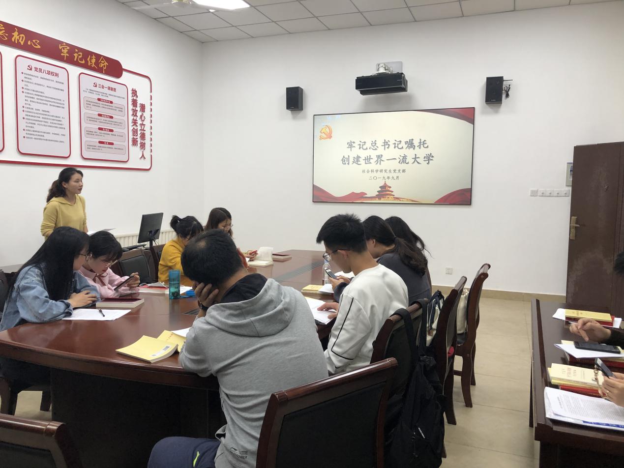 为深入贯彻习近平总书记关于“不忘初心,牢记使命”主题教育精神、深入领会习近平新时代中国特色社会主义思想,2019年9月30日下午,社会科学研究生党支部于南平101教室开展以“牢记总书记嘱托,创建世界一流大学”为主题的学习活动,此次活动由党支部书记王慧楠主持,支部成员积极参加了此次会议。