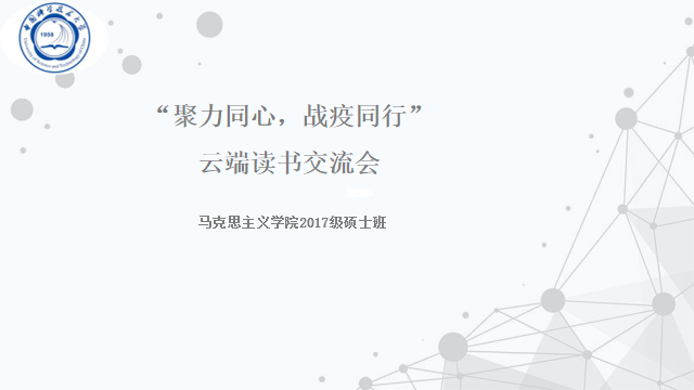 为落实教育部思政司《关于2020年“5·25大学生心理健康月”举行“四个一”专项行动的工作提示》,推进《高等学校学生心理健康教育指导纲要》的实施,提升高校心理育人工作质量,增强学生心理健康素质,引导学生健康成长、快乐生活,积极应对疫情特殊时期,马克思主义学院2017级硕士研究生全体同学,在心理委员张文祥的组织下,于2020年5月27日下午2:30举办以“聚力同心,战疫同行”为主题的云端读书分享会。
