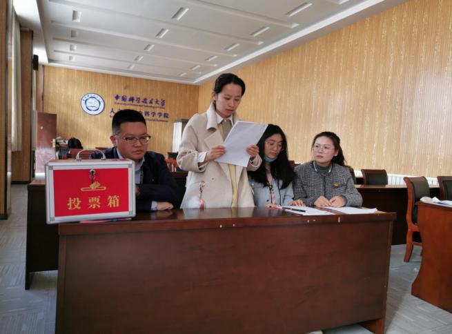 大会审议通过了《中国共产主义青年团中国科学技术大学团总支委员会委员选举大会议程》和《中国共产主义青年团中国科学技术大学团总支委员会委员选举办法》,并对马院团总支筹备组提名的监票人、计票人建议名单进行了审议和表决。本次大会采取无记名投票方式,差额选举产生了由刘海龙、胡婷玉、许壹言、许珂4人组成的第一届马克思主义学院研究生团总支委员会。