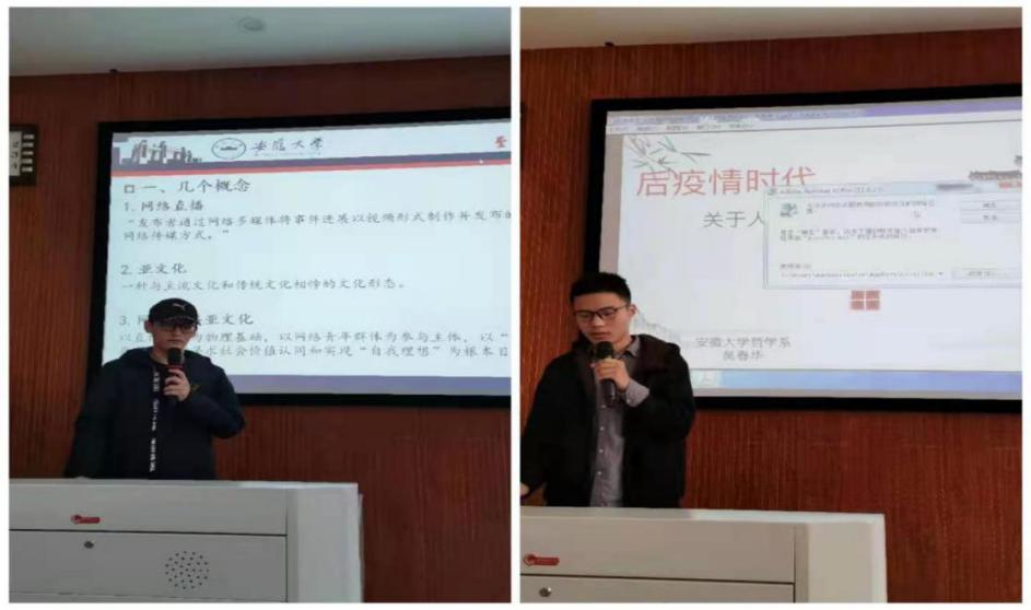 论坛下半场,征文三等奖获得者安徽大学武豹同学向大家陈述了自己对网络直播亚文化的表征、症结与治理的理解和认识。征文三等奖获得者安徽大学吴春华同学从哲学的角度,对人的本质进行了文本梳理,思考并总结了疫情对人与自然关系的启示。