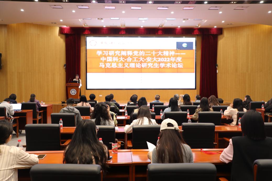 为深入学习宣传贯彻党的二十大精神,持续深化习近平新时代中国特色社会主义思想研究,切实提高新时代马克思主义理论研究生的学术科研水平和宣传阐释能力, 2023年4月16日,2022年度中国科大·合工大·安大马克思主义理论研究生学术论坛在东区物质科研楼三楼报告厅成功举办。