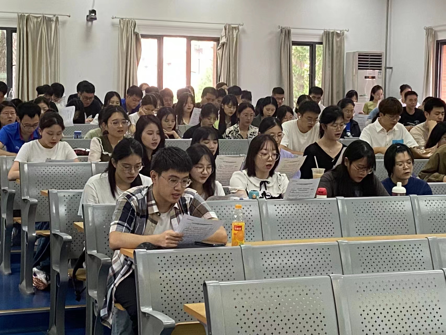 916上午,在一教1202教室,同学们学校歌《永恒的东风》和共青团团歌《光荣啊,中国共青团》,校歌见证了科大几十年的辉煌历程,也是同学们“饮水思源,为校争光”的第一课。同学们自豪地唱响了这首歌,对校训“红专并进,理实交融”有了更深入的理解,爱国爱校之情油然而生