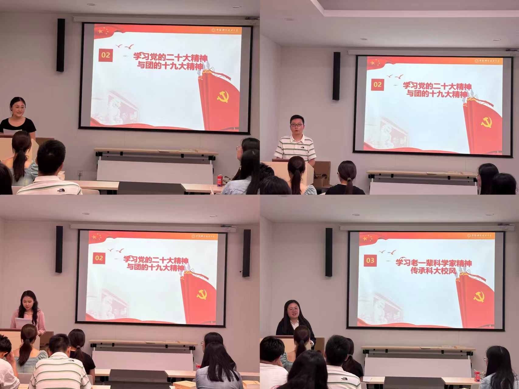 随后,同学们共同学习党的二十大精神与团十九大精神,赵新伟、段善杰和李艳丽同学分别进行心得分享。赵新伟同学表示在党的二十大报告中,习近平总书记对青年寄予殷殷嘱托与无限期待,我们要认真研读二十大报告,贯彻二十大精神,并落实到平时学习和工作中。段善杰同学表示,党的二十大回顾过去五年的工作,我们党团结带领人民,攻克了许多长期没有解决的难题,身为一名马院的大学生,深感自己责任和使命。李艳丽同学谈到,历史和实践充分证明,中国共青团不愧为中国青年运动的先锋队,不愧为党的忠实助手和可靠后备军,我们作为当代青年要有功成不必在我,功成必定有我的决心,挺膺担当、奋力拼搏,在新征程上跑好属于我们这代人的这一棒。最后,通过播放老科学家系列微电影,让同学们重温钱学森、郭永怀等老一辈科学家的光辉事迹老一辈科学家在国家需要时“虽千万人,吾往矣”的精神使同学们深为感动