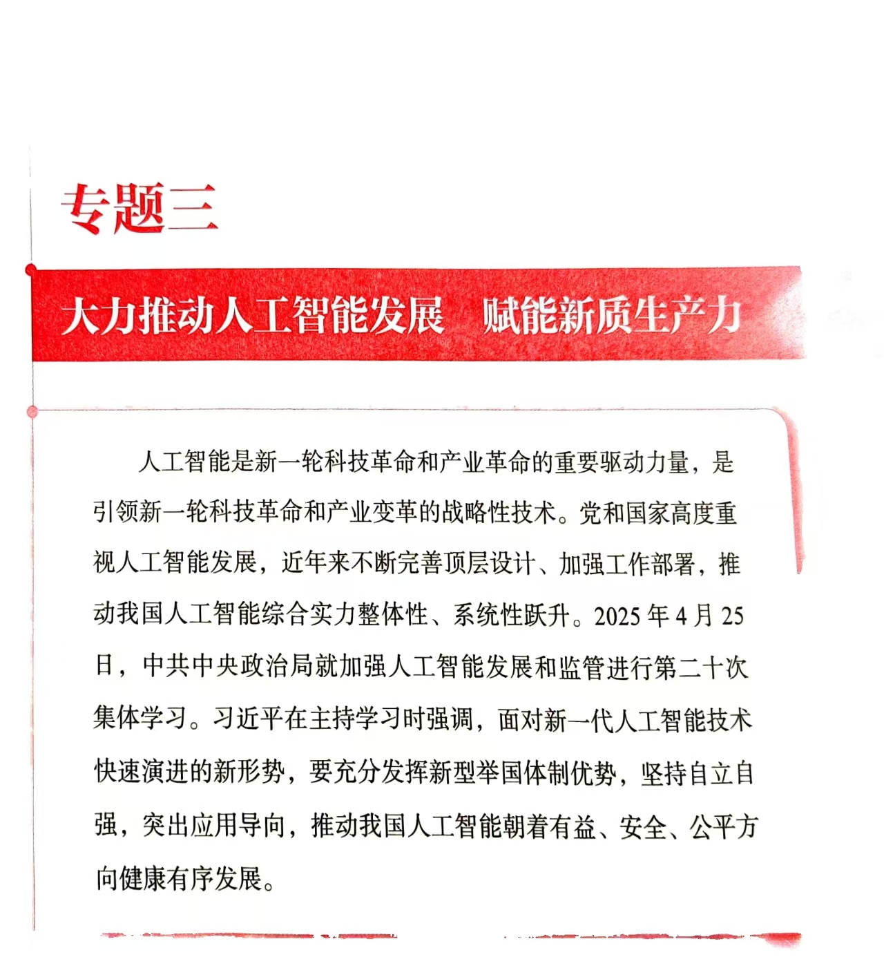 此次教材编写特别聚焦科技创新领域,将人工智能发展纳入国家战略全局进行系统解读。刘立、应验两位教师长期深耕马克思主义中国化与科技创新政策交叉领域,近年来完成相关课题多项,发表学术论文、理论文章十余篇,具备深厚的研究基础。 “大力推动人工智能发展 赋能新质生产力”专题重点阐述三个主题:人工智能在新一轮科技革命和产业变革中的重要作用、加快人工智能科技创新与产业创新、人工智能赋能新质生产力发展。研究生赵新伟、王晓凯、刘静静、张啸宇参与了初稿写作。