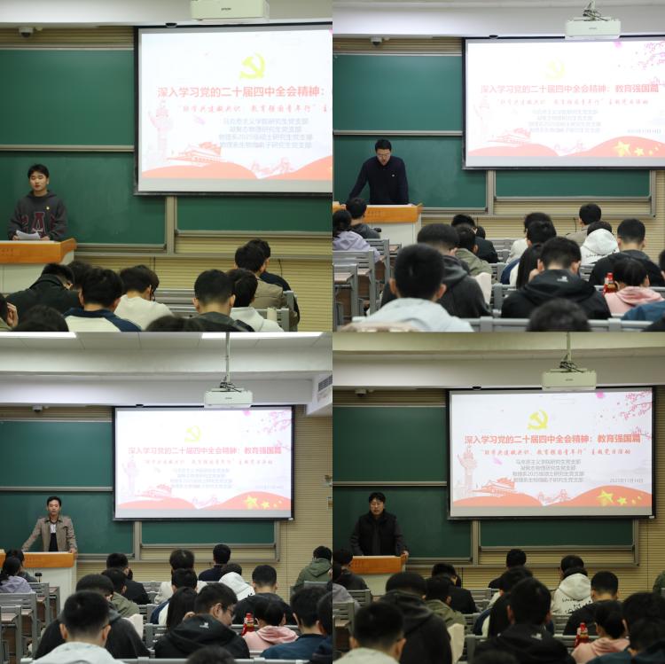 11月14日晚,马克思主义学院研究生党支部、凝聚态物理研究生党支部、物理系2025 级硕士研究生党支部、物理系微电子研究生党支部联合举办主题为“联学共建凝共识,教育强国青年行”党建联学共建活动,学习党的二十届四中全会精神,聚焦“教育强国”战略部署,共探教育强国建设的青年担当。