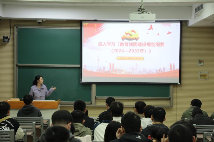接着,由马克思主义学院研究生党支部纪检委员刘徐纳领学《教育强国建设规划纲要(2024-2035 年)》。她深入阐述了“教育强国”的历史演进和时代内涵,全面系统地解读了《教育强国建设规划纲要(2024—2035年)》的主要内容,并鼓励各位青年党员做深学细悟的先行者、立德树人的践行者、攻坚克难的担当者、团结奋进的促进者。