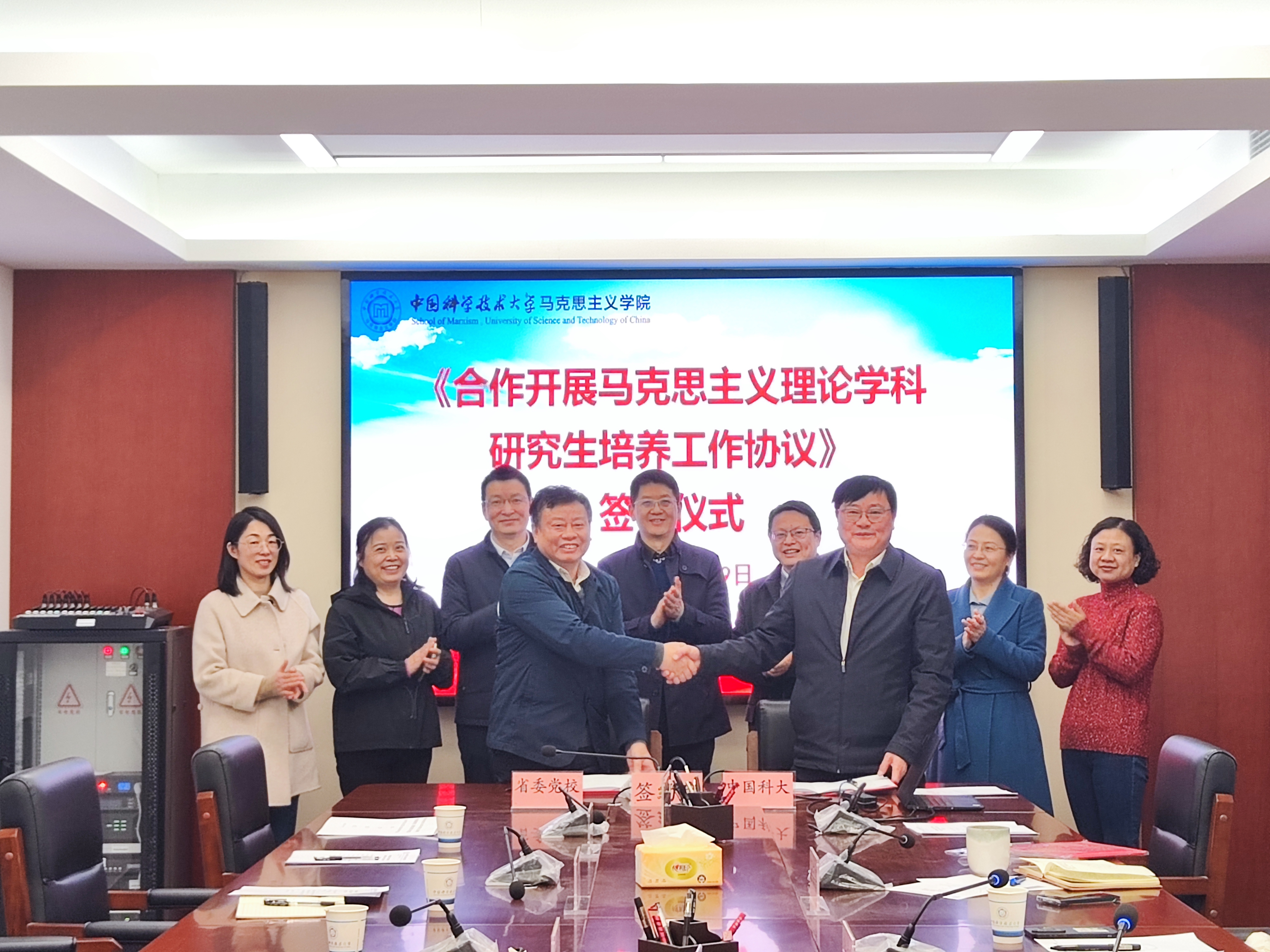 11月19日上午,中国科学技术大学马克思主义学院与安徽省委党校(安徽行政学院)研究生部合作开展马克思主义理论学科研究生培养工作签约仪式在中国科大马院310会议室隆重举行。安徽省委党校潘理权副校长、研究生部主任郭伟、研究生部党支部书记储结兵、研究生部副主任姚先霞、教务部四级调研员胡珏,马克思主义学院执行院长刘立、党总支书记褚建勋、副院长汤俪瑾、副院长魏荣出席签约仪式。会议由褚建勋主持。