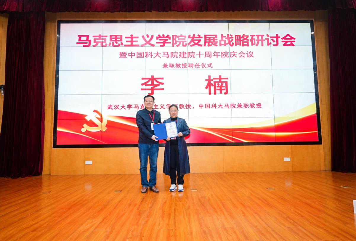 庆典现场还举行了兼职教授聘任仪式,李峰为武汉大学马克思主义学院李楠教授颁发聘书,聘请其担任中国科大马克思主义学院兼职教授,为学院学科建设、人才培养与学术研究注入新的动能。