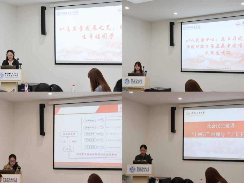 随后,合肥工业大学马克思主义学院苏露露同学首先从新质生产力的内涵出发,结合实践案例,系统阐释了新质生产力如何通过筑牢就业根基、升级公共服务质感、拓宽居民增收渠道,成为推动民生提质增效的核心引擎。郑灵昕同学围绕“高质量发展是全面建设社会主义现代化国家的首要任务”展开论述,指出其核心在于贯彻新发展理念,根本目的是满足人民日益增长的美好生活需要,并从创新、协调、绿色、开放、共享五个维度,深入剖析了高质量发展如何助力绘就民生幸福图景。徐章妍同学立足于“十四五”收官与“十五五”启航的历史交汇点,指出我国社会民生建设正实现从“被动保障”向“主动引领”的战略转变,未来将迈入以“高质量发展”为鲜明特征的崭新阶段,从而为中国式现代化注入更为强劲、持久的内生动力。