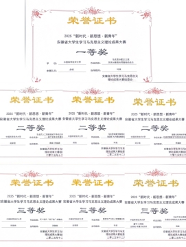 近日,由安徽省教育厅主办、合肥工业大学承办的2025年“新时代·新思想·新青年”安徽省大学生学习马克思主义理论成果大赛评审结果公布。我院组织报送的7件作品全部获奖,共获得一等奖1项、二等奖3项、三等奖3项,1位教师获评“优秀指导教师”。